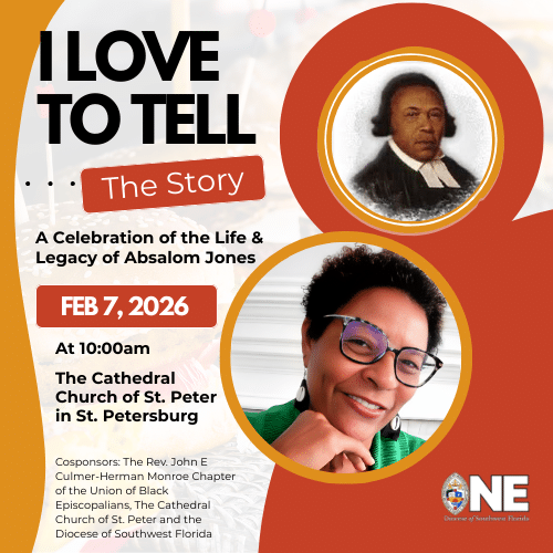 The Diocese of Southwest Florida, in partnership with the Cathedral Church of St. Peter, is pleased to invite you to “I Love to Tell the Story: A Celebration of the Life and Legacy of Absalom Jones,” to be held on Saturday, February 7, 2026, at the Cathedral Church of St. Peter. This day-long gathering will honor the faith, witness, and enduring legacy of Absalom Jones—the first African American ordained as a priest in The Episcopal Church—through storytelling, reflection, worship, and community.…